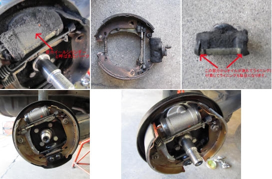 上段中写真:ライニングとホイールシリンダーを外した写真。しかし汚いですね〜。見た目もブレーキ効きそうにないですよね。