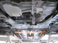 取付けた後に前方(エンジンルーム側)から下回りを撮ったところです。一番手前に見えるのはエンジンとミッションですね。取付け位置は丁度触媒の上になります。
