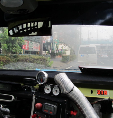 さ〜出発するぞ!と出ようとした途端、レジャンドブルーの呪としか思えない位の大雨が......。(さっきまで晴れてたのに....。)空調の付いてないトゥインゴは窓ガラスが曇る曇る........。昔々は車に必需品だったクリンビューが欲しい!