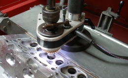 ここで自称レーサーNちゃんのお勧めが!ポート研磨〈ポート研磨?→今回行なったポート研磨は簡単に言うと混合気が通る通路を若干広くしてツルツル・スベスベに研磨して気体の流れを良くする事でシリンダー内にいっぱい混合気を入れて爆発パワーを大きくする事です、排気側もやったので排気ガスをシリンダーからスムーズに排出する事が出来ます。〉それとお約束の面研(簡単に説明するとヘッドを若干削り圧縮比を上げる作業です。シリンダー内が削った分狭くなるのでエンジンの爆発力が上がりパワーアップします)そしてバルブの擦り合わせへ!(バルブの擦り合わせとは?→とっても簡単に言うとバルブが閉じたとき、ぴたりとふたができるようにすること。混合気が漏れなくする事)その後バルブシールの交換をしてまた組み上げて行きます。