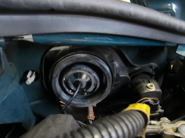 上段左の写真は施工前のヘッドライト裏側です。カバーを切って取り付ける様になります(写真撮り忘れて違う車の画像です)