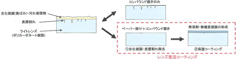 劣化したヘッドライトの外側を透明になるまで磨いて綺麗にし、その上に特殊コーティングを施して表面を修復しレンズの輝き・光度を復活させてその輝きを持続させます。下の絵が今までの磨きとレンズ復活コーティングの違いを書き出した物です。今までの磨くのみに加えてもう一工程のコーティングが追加される事によって新品の様な輝きが持続されます。(大体2年程度)