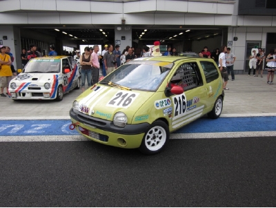 予定通り無事6時前に到着し準備に加わります。先ずはピットへ!皆に挨拶してテントの設営や他のチームの方々に挨拶回りです。そうこうしているうちに、ピットクルーを手伝ってくれるお客さんやドライバー志願のお客さんが集まって来ました。そして今年の栄えあるスタートドライバーはTipo編集部のメット坂上さんです。K4GPは変則ルマン式スタートなのでまずピットからクラス事にスタートしメインスタンド前に整列。仮装したチームスタッフがコース反対側から走ってステッカーを剥がしたらスタートになります。ところが何とトゥインゴだけスタートしません!(オーマイガッ!)スタートが出来ずピットまで押されて帰って来てピットスタートに!実はイモビライザーが効いてしまいエンジンが掛からなかった...。と間抜けすぎる理由でビリに転落...。去年に引き続きこちらの説明不足です.....。(詳細はTipo10月号No256を見て下さい)