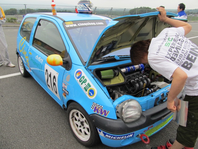 サーキットに着いて準備をしていると、21世紀最大級の助っ人!『八木山峠のローリングスター』を名乗るルノー福岡中央のT部長が講習を終えてやってまいりました。メーター類の説明をしていると、走行時間になりました。まずは営業Mが最初に乗り込みます。お〜パワー出てる!これが第一印象。エアースクロールチャンバー効いてるかも!シケインからの登りが去年とは全く違い、3速でも勿論、4速でも登って行きます。1年振りの富士も35秒出るし、これで燃費さえ良くなれば今年は今までに比べ楽しめるぞ!
