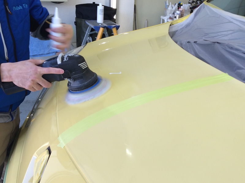 まずはボディ以外の磨かないパーツ(モールやヘッドライト等)にマスキングテープを貼っていきます。(ポリッシャーで傷つけたりし無い為の処置)傷ついたり薬剤が飛び散ったりし無い様に貼り終わったら、ポリッシャーで磨いていきます。まずは粗めのバフ(スポンジの様な物)で怪しい薬剤を塗りつけて磨いていきます。塗装面が熱を持たない様に機械自体もただ単純に回転するだけでは無くのの字を書く様に回転してます。(プロの持ち物は違いますね。ポリッシャーだけでも10点近くお持ちでした。塗装状態によって色々と使い分けするらしい)お〜磨いている箇所が霞みが晴れていく〜!ある程度磨くと今度は目の細かいバフに交換しと何度か磨きを掛けて最後に独自調合したコーティング剤(数種類)を何層にも塗り込んで行きコーティング剤がある程度固まったら出来上がりです!